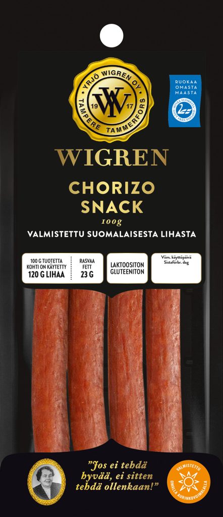 Ingredienser: Svinkött (Finska), späck (Finska), nötkött (Finska), salt med jod, kryddor (paprika, cayenne, vitlök, oregano, SENAPSFRÖ), aromer, dextros, antioxidationsmedel (E300), konserveringsmedel (E250), kollagen. Kraftigt saltad